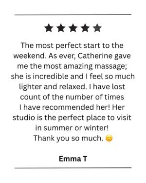 Hi, I’m Catherine, I’ve been a therapist for 19 years and bring a wealth of experience to my treatments. I am passionate about working with women on an ongoing basis to help them maintain optimum health and well-being. Along with holistic/ deep tissue massage, I offer a range of holistic therapies. Your treatment will always be tailored to meet your needs on the day and may incorporate a combination of different therapies to provide a truly unique experience. I work from my beautiful home studio and use high quality, natural products.